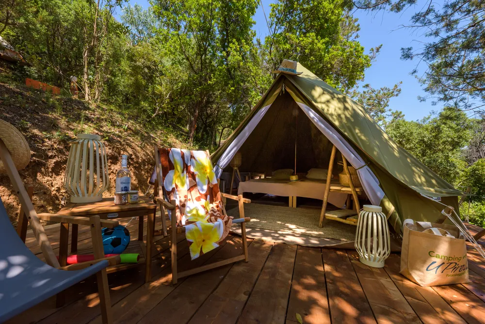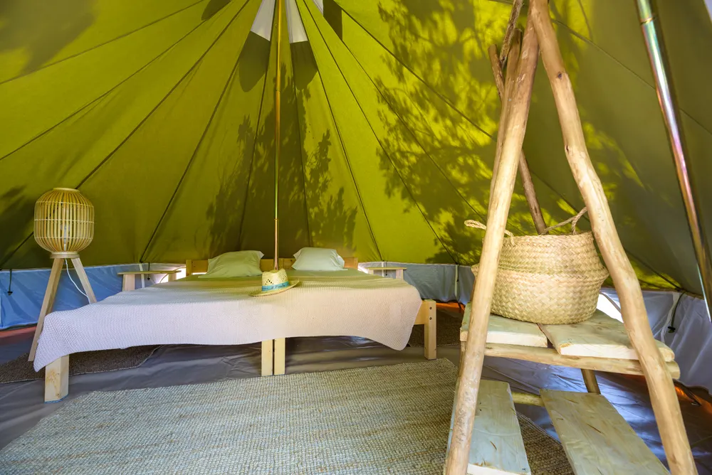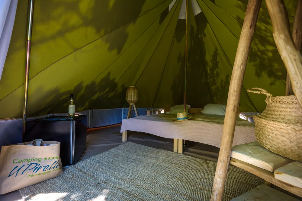Charmante tente de glamping pour 2 personnes équipée d'un mini frigo pour vous offrir un confort optimal tout en vous permettant de profiter de la nature environnante.